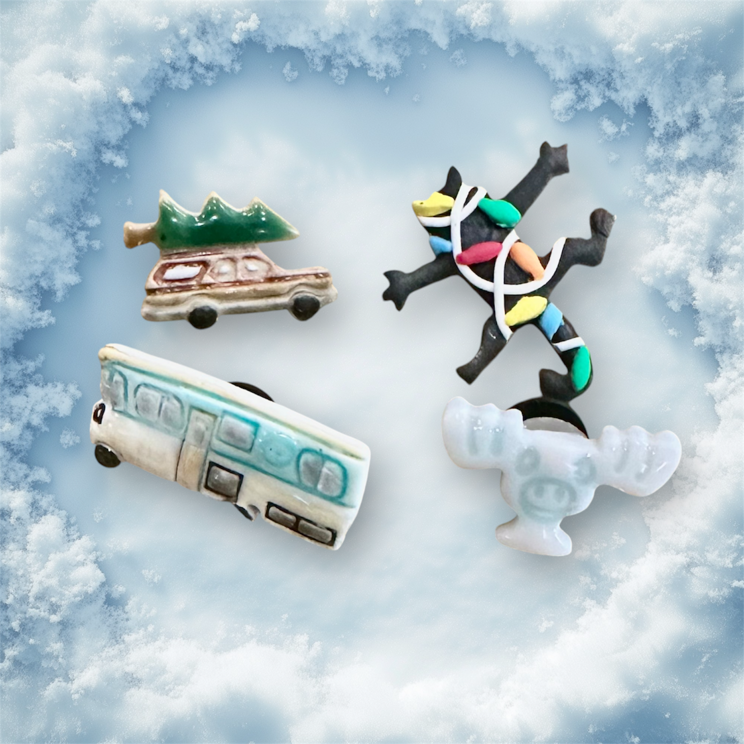 Introducing our Christmas Vacation Lapel Collection, perfect for the holiday season. Handcrafted from polymer clay, our lapel pins feature iconic symbols from the beloved movie, such as Eddie's RV, Wally World's eggnog glass, fried pussycat and the Griswoldmobile. Elevate your style and add a touch of festive nostalgia to any outfit.