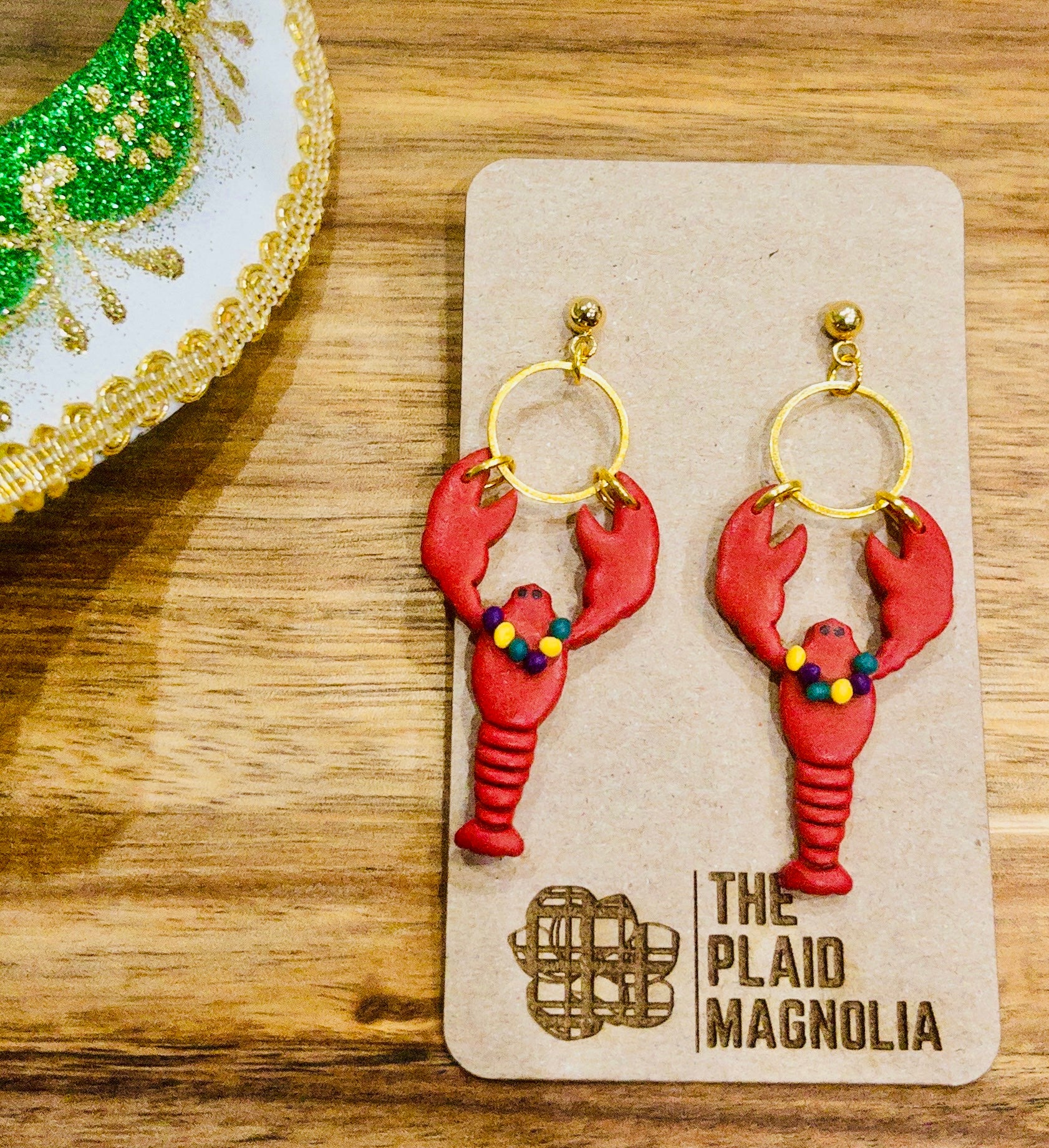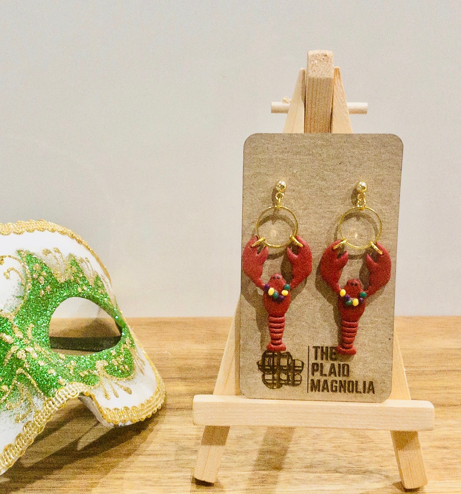 Add some spice to your wardrobe with these playful Carnival Crawfish earrings! Made from polymer clay, these quirky crawfish are adorned with Mardi Gras beads for a festive touch. The perfect accessory for any Mardi Gras celebration or just to add some fun to your everyday look!