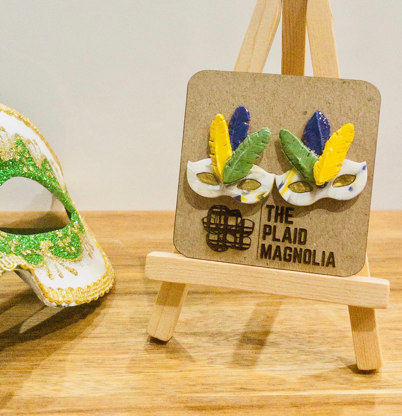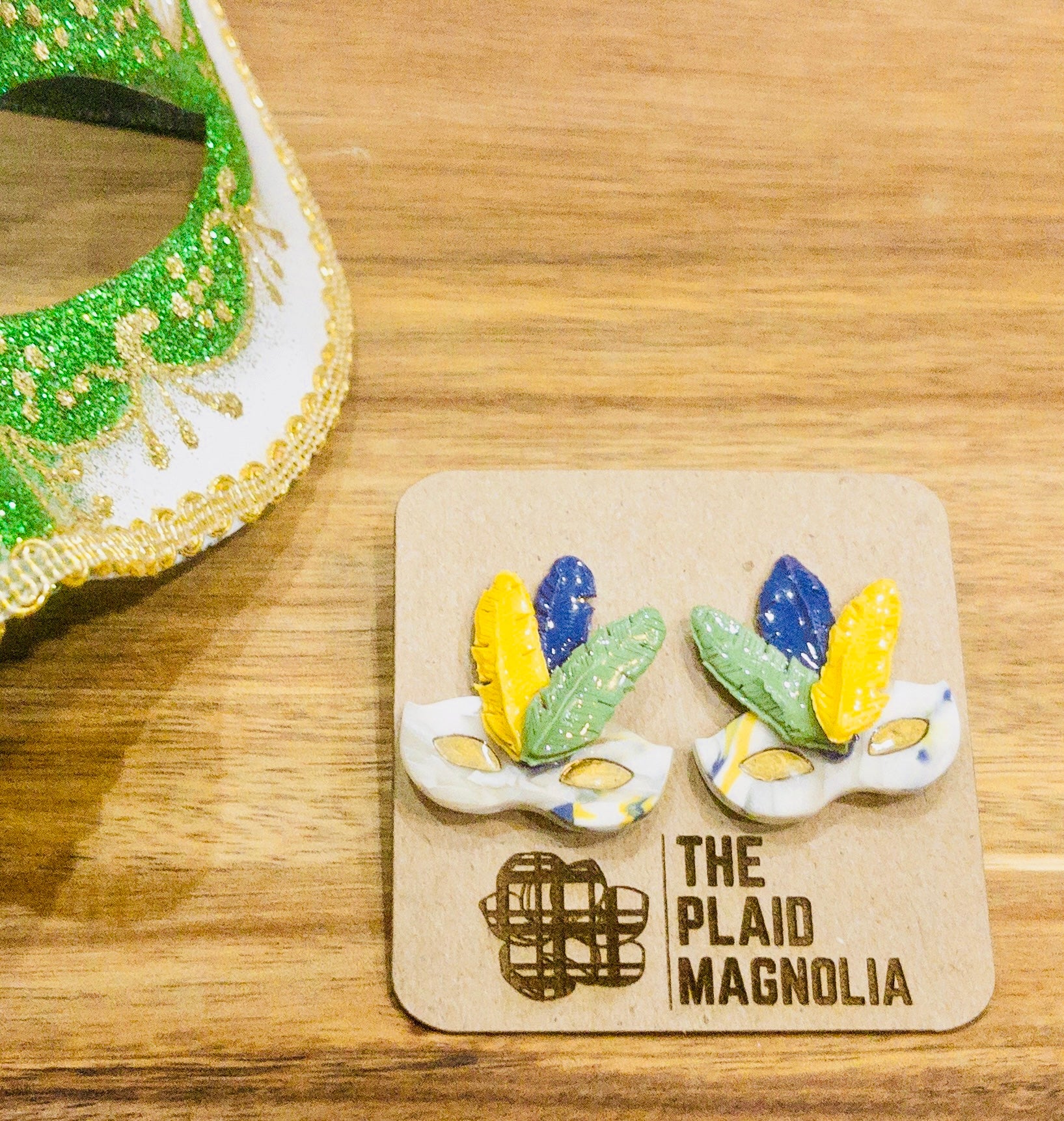 Unleash your inner carnival spirit with our Feathered Carnival Mask. Handcrafted with polymer clay and adorned with vibrant clay feathers in every Mardi Gras color, this mask is a true work of art. Bring this luxurious and exclusive piece to your next celebration and stand out in the crowd.