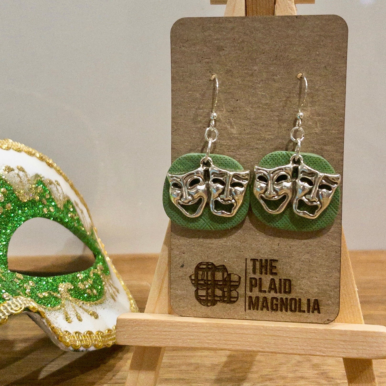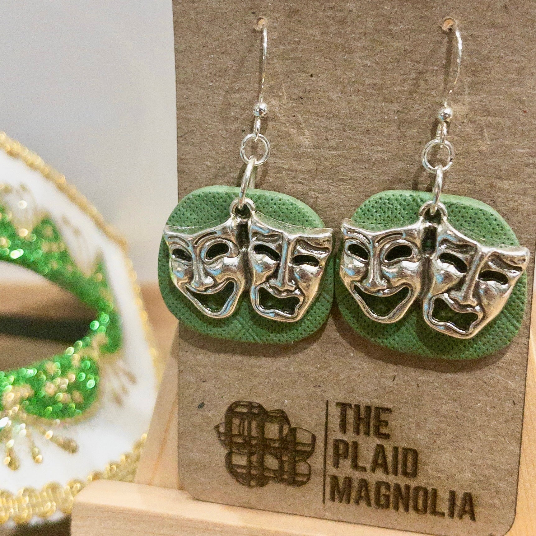 Elevate your style with our Green Carnival Mask Dangle earrings. Crafted from textured green polymer clay, these earrings feature a stunning metal carnival mask charm. Embrace the opulence and sophistication of the carnival with these exclusive statement earrings.