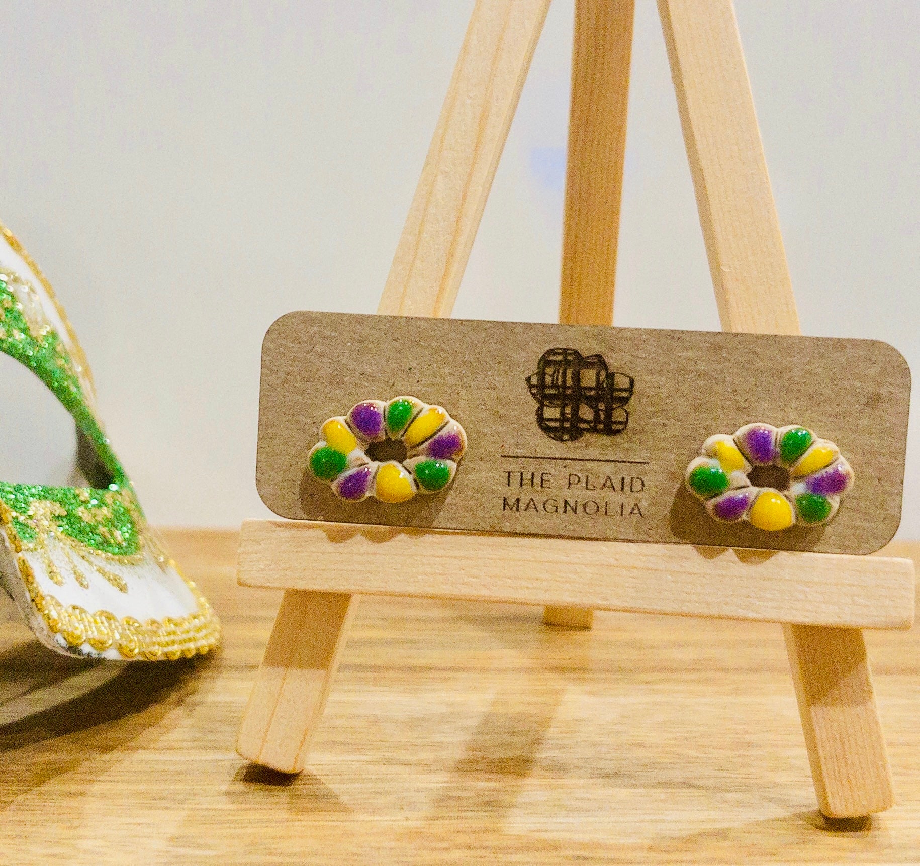 Indulge in the decadent delight of our King Cake Studs. Handcrafted from luxurious polymer clay, these stud earrings feature a vibrant and intricate king cake design. Perfect for adding a touch of sophisticated whimsy to any outfit. Treat yourself to a little piece of wearable art.