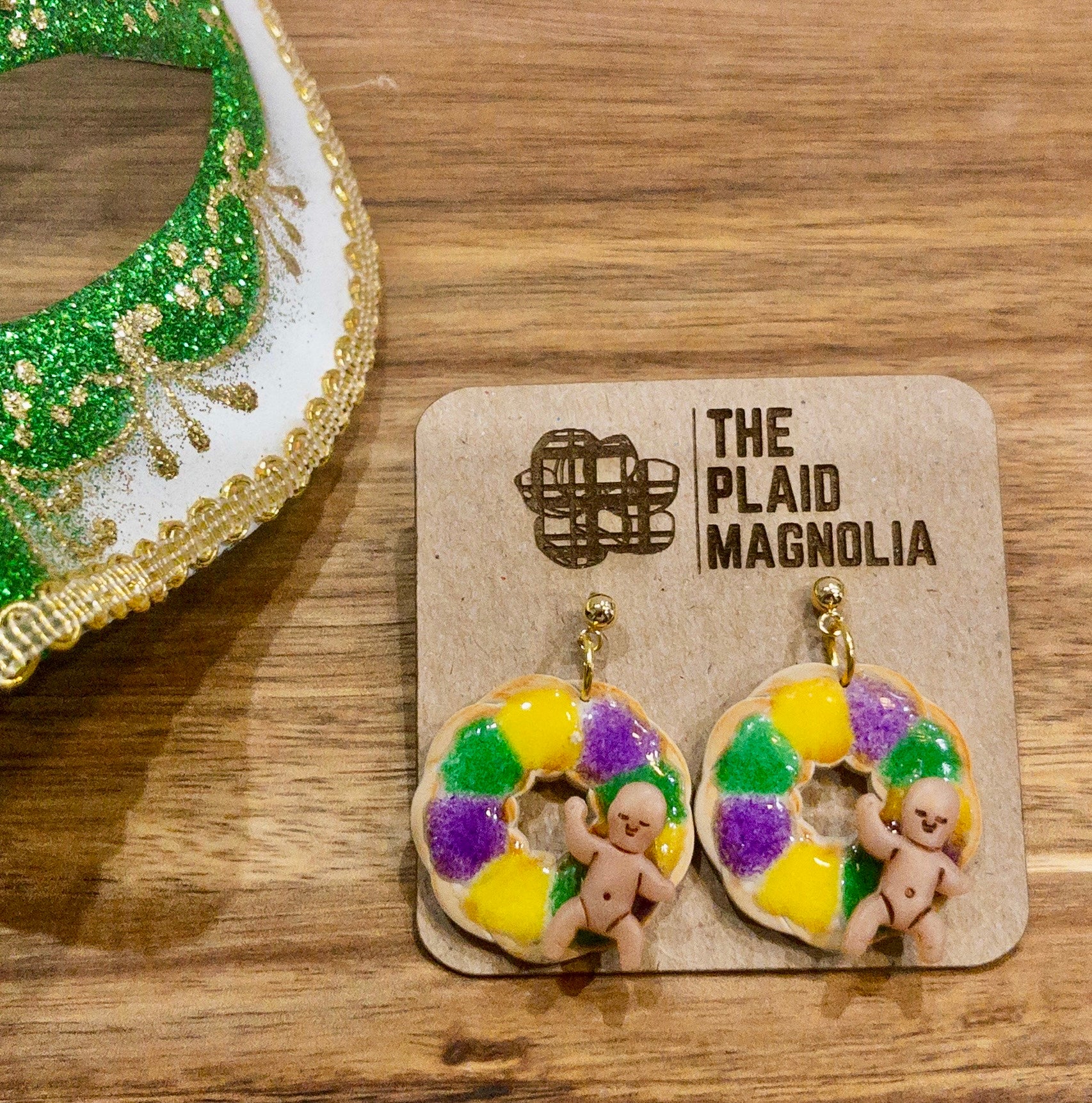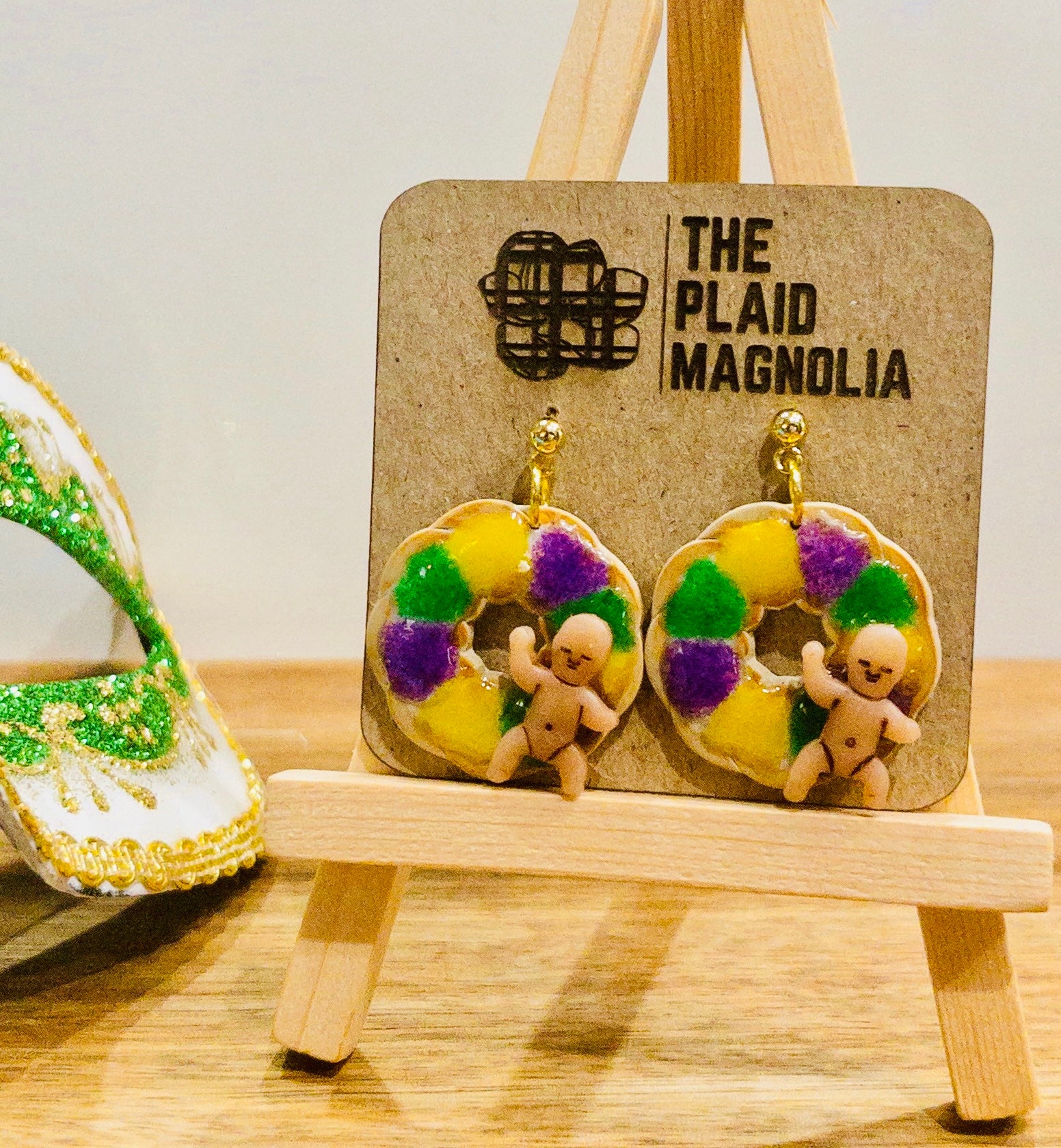 Indulge your fashion sense with a sweet treat that won't go straight to your hips! Our King Cakes earrings, crafted from durable polymer clay, feature the iconic king cake baby. A quirky and playful addition to any outfit, perfect for Mardi Gras or any celebration.