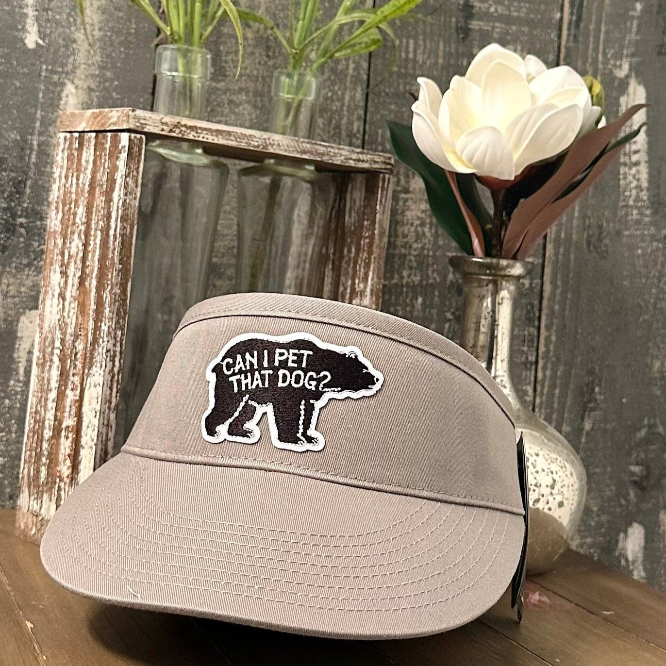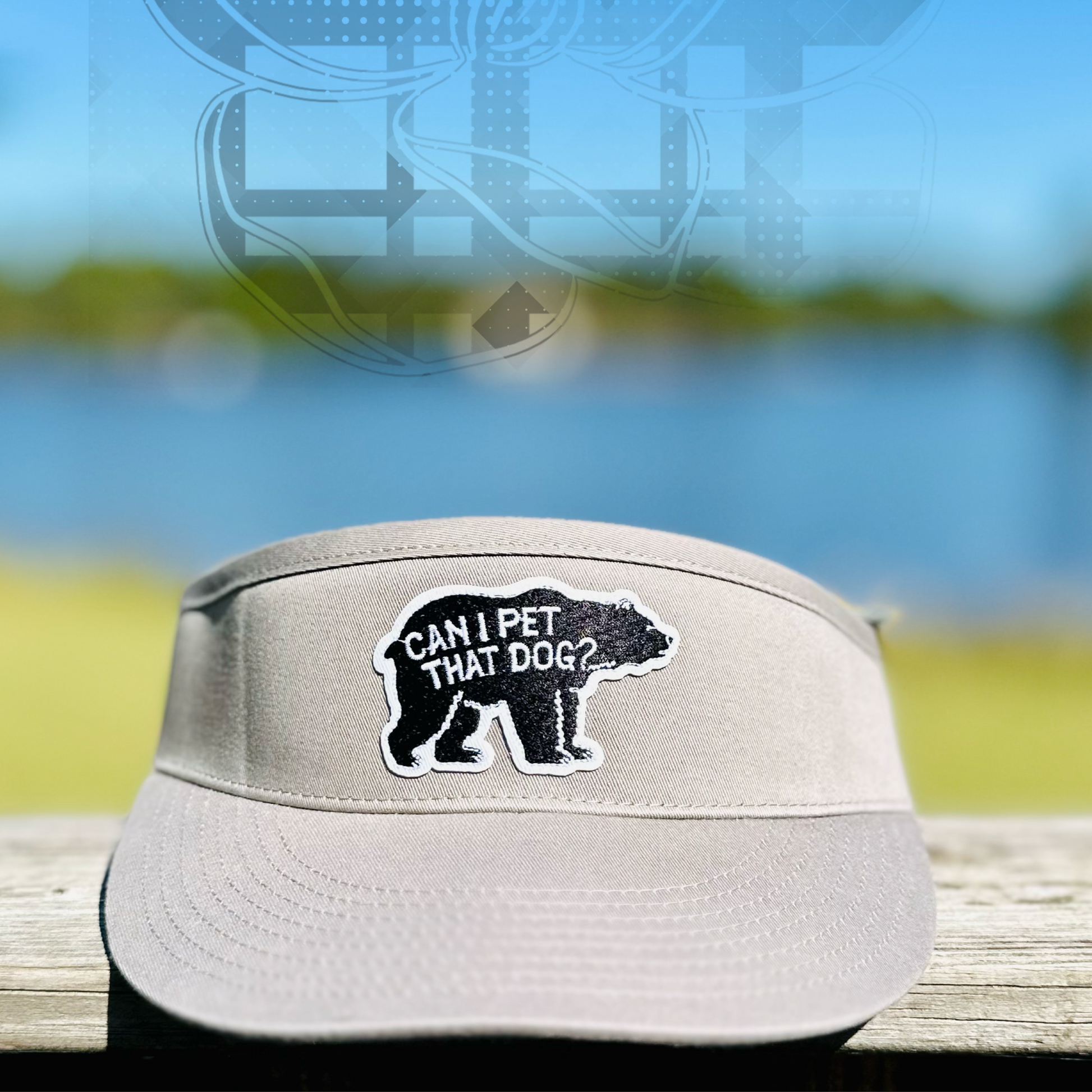 Pet that Dog with this quirky novelty embroidered patch visor. The high crown visor features a hook and loop closure and performance-lined inner padding, keeping you cool and dry while petting that "bear" of a dog. Don't miss the Plaid Magnolia embroidered patch on the side. Woof!