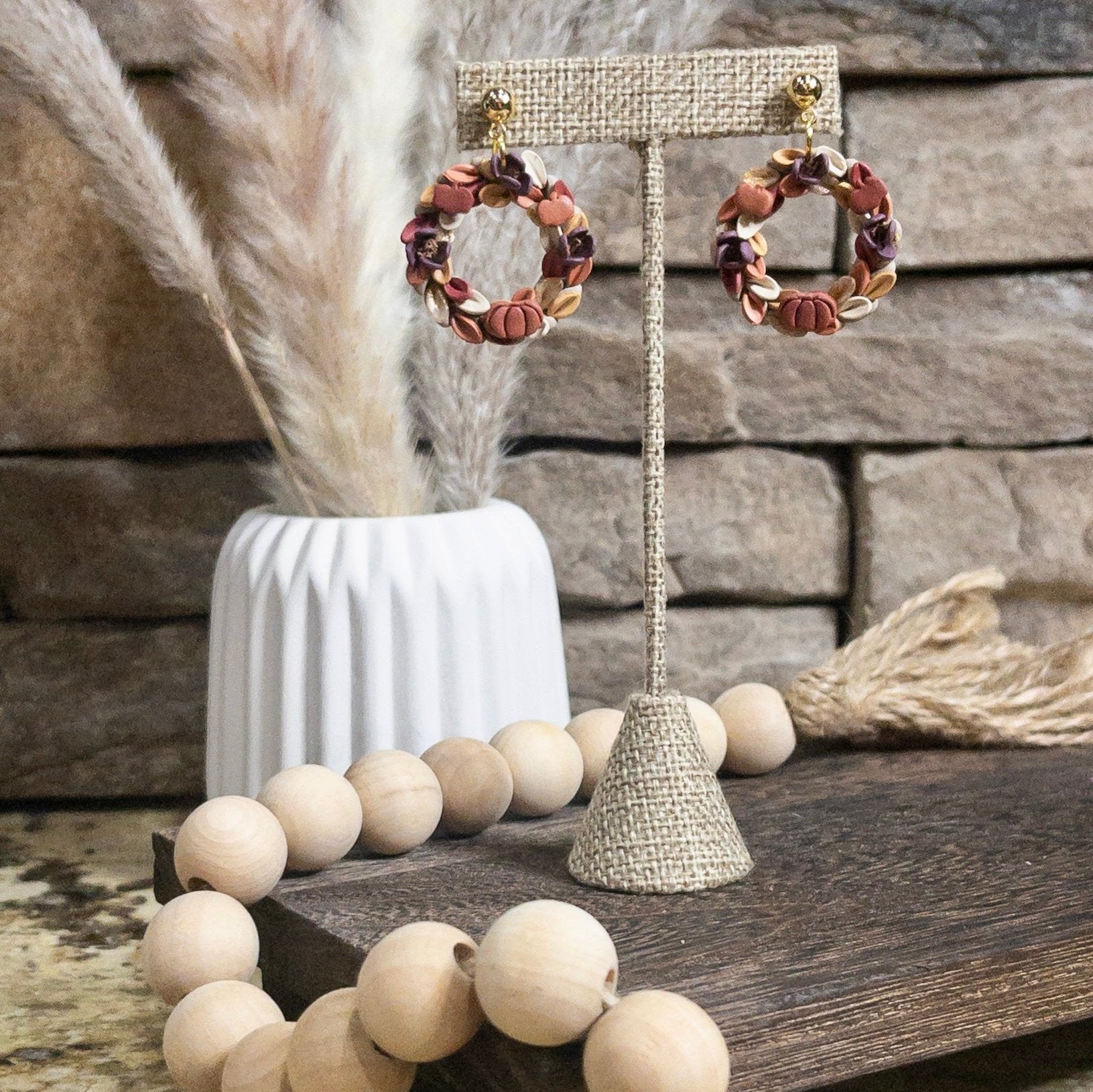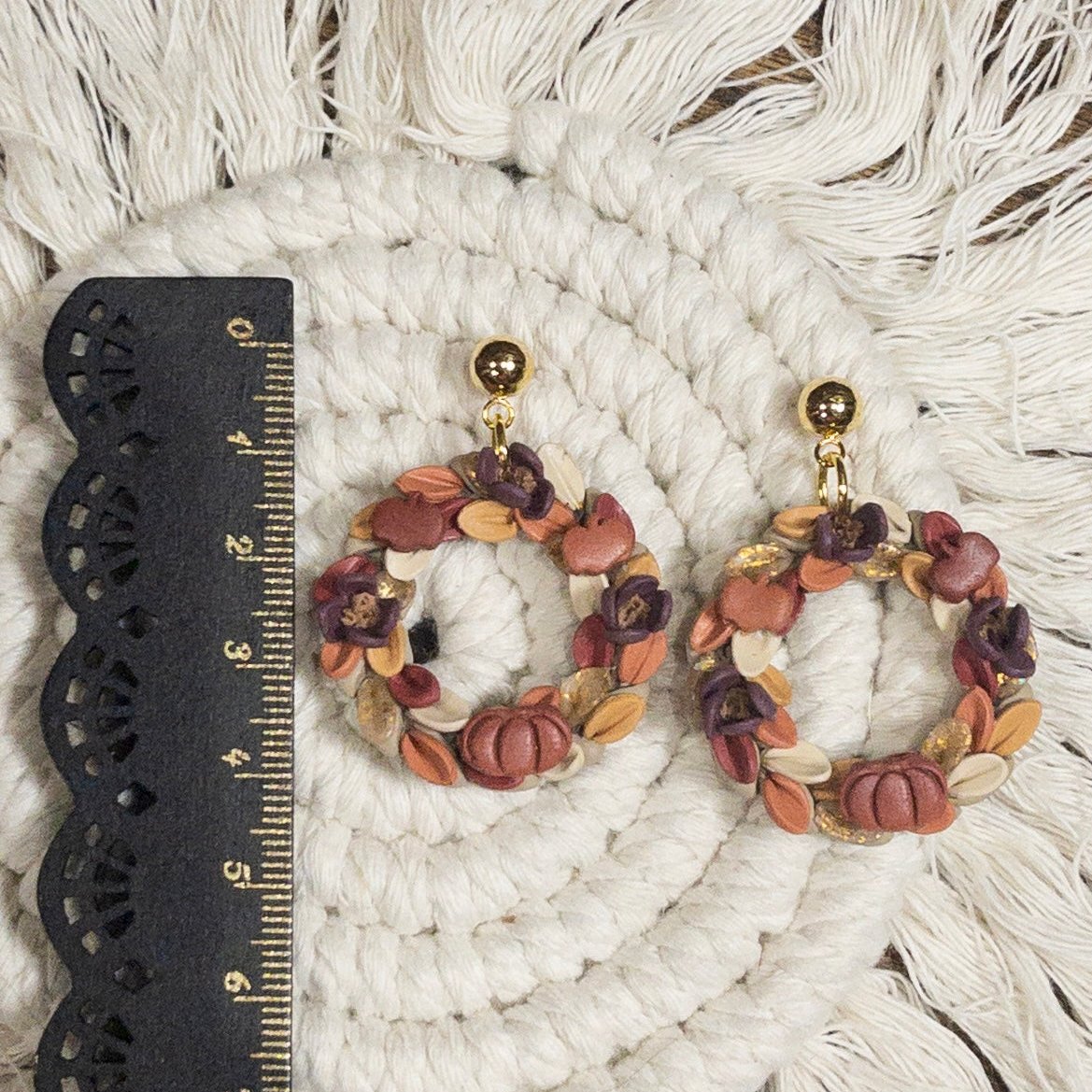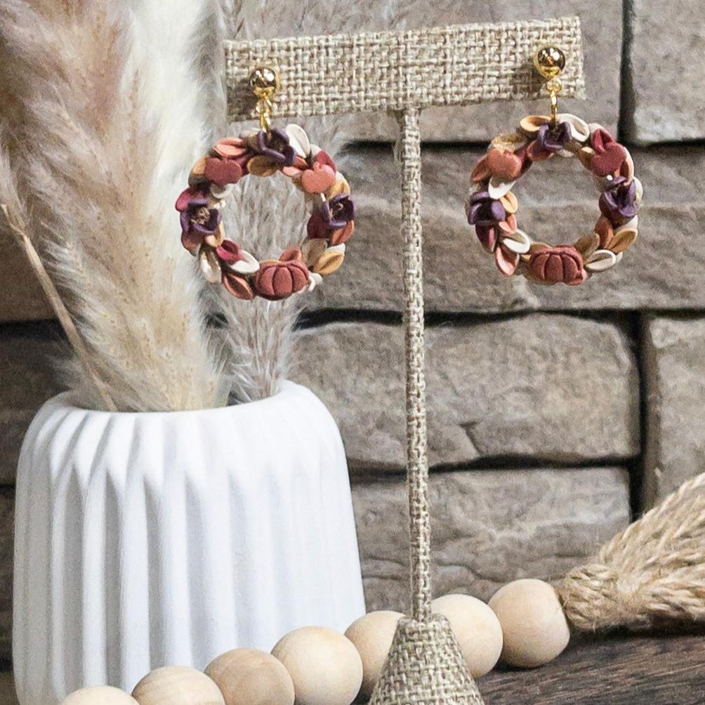 Exude the essence of autumn with our Pumpkin Wreath earrings. Handmade with polymer clay, these hoop earrings feature delicate pumpkins entwined in a wreath. Perfect for adding a touch of seasonal charm to any outfit. Limited edition, get yours now.