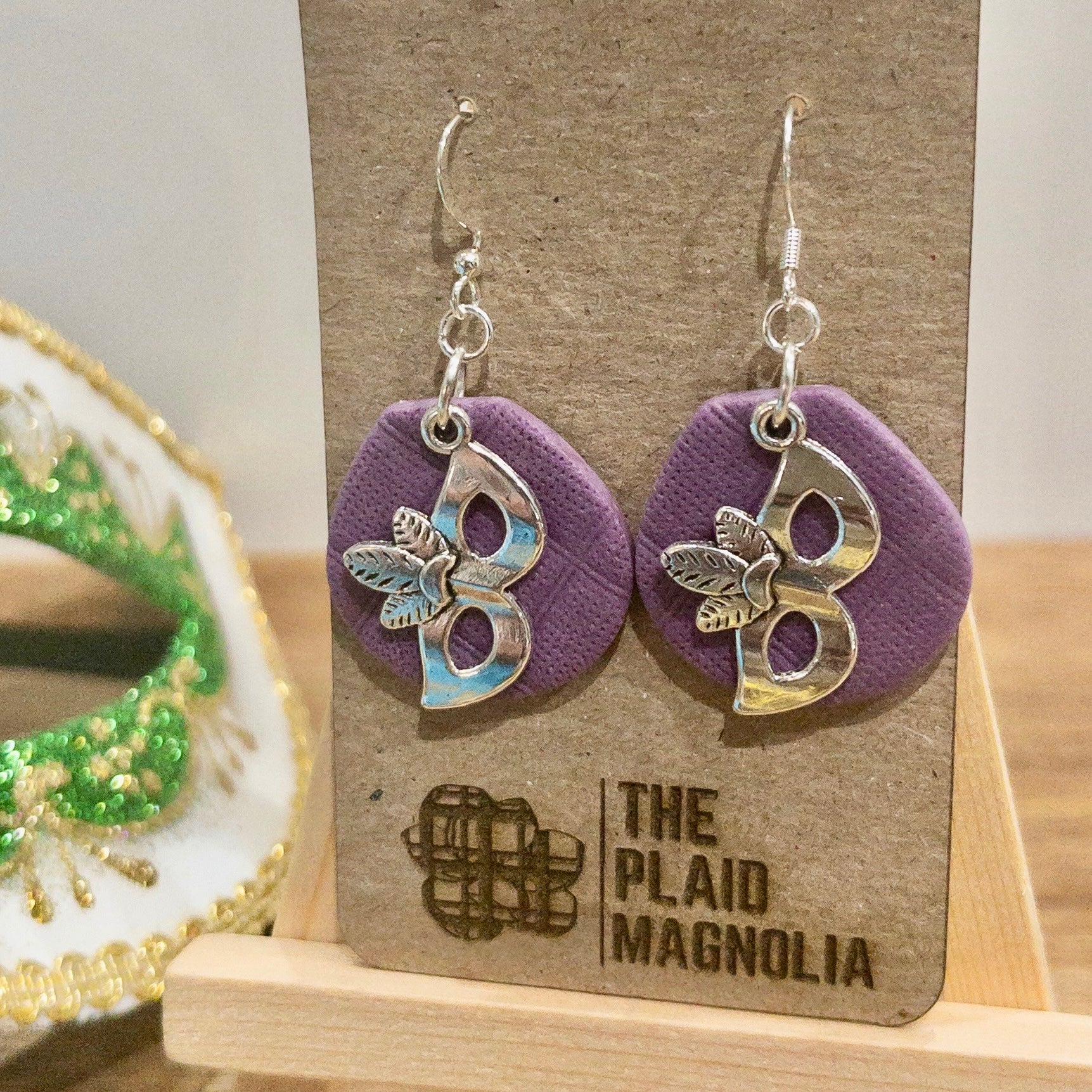Be the talk of the party with our Purple Carnival Mask Dangle earrings. These stunning earrings feature a textured purple polymer clay design accented with a metal carnival mask charm. Stand out in style and elevate your look with this exclusive and sophisticated accessory. Perfect for any elegant occasion.