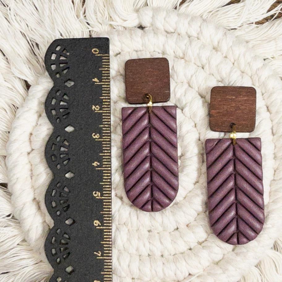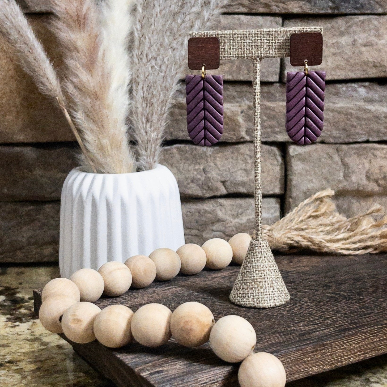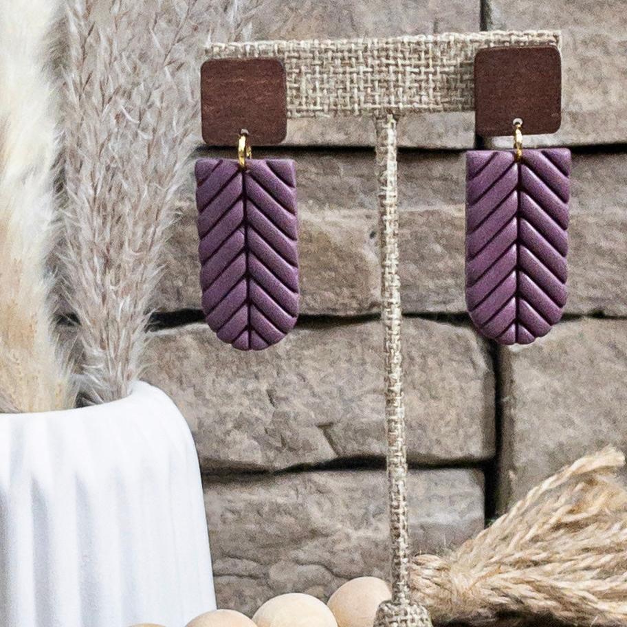 Introducing Rowan, a true work of art. These exquisite earrings feature a stunning chevron design crafted from premium polymer clay and wood. Available in elegant eggplant or chic smoke gray, these earrings are a must-have for any fashion-forward woman who appreciates the finer things in life. Enhance your style and make a statement with Rowan.