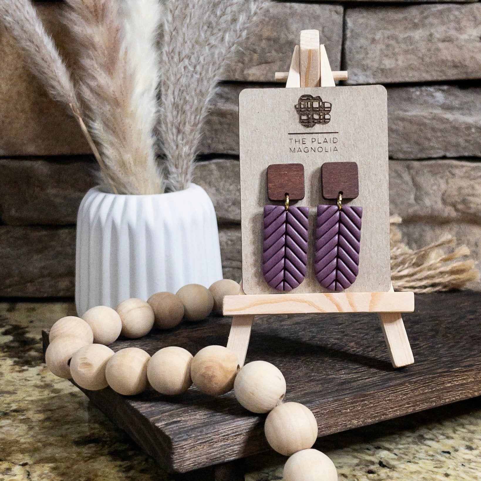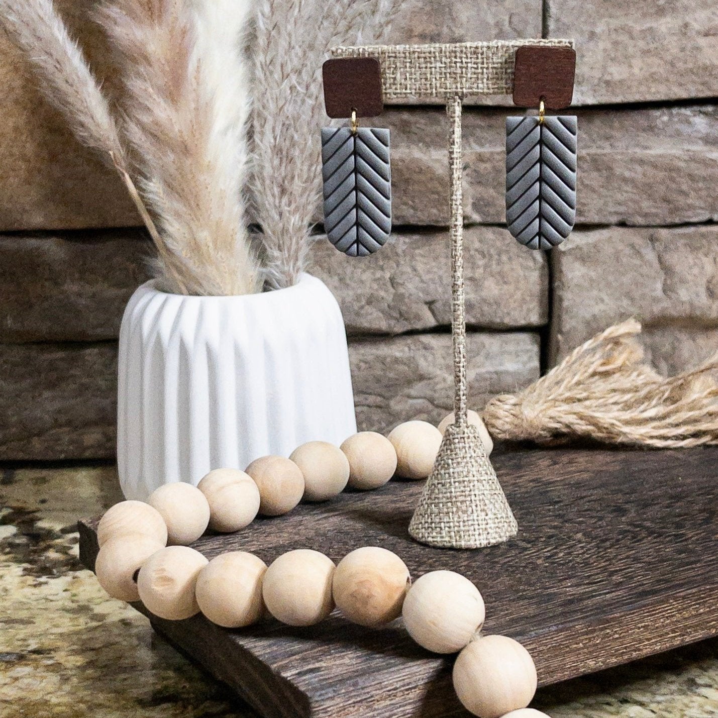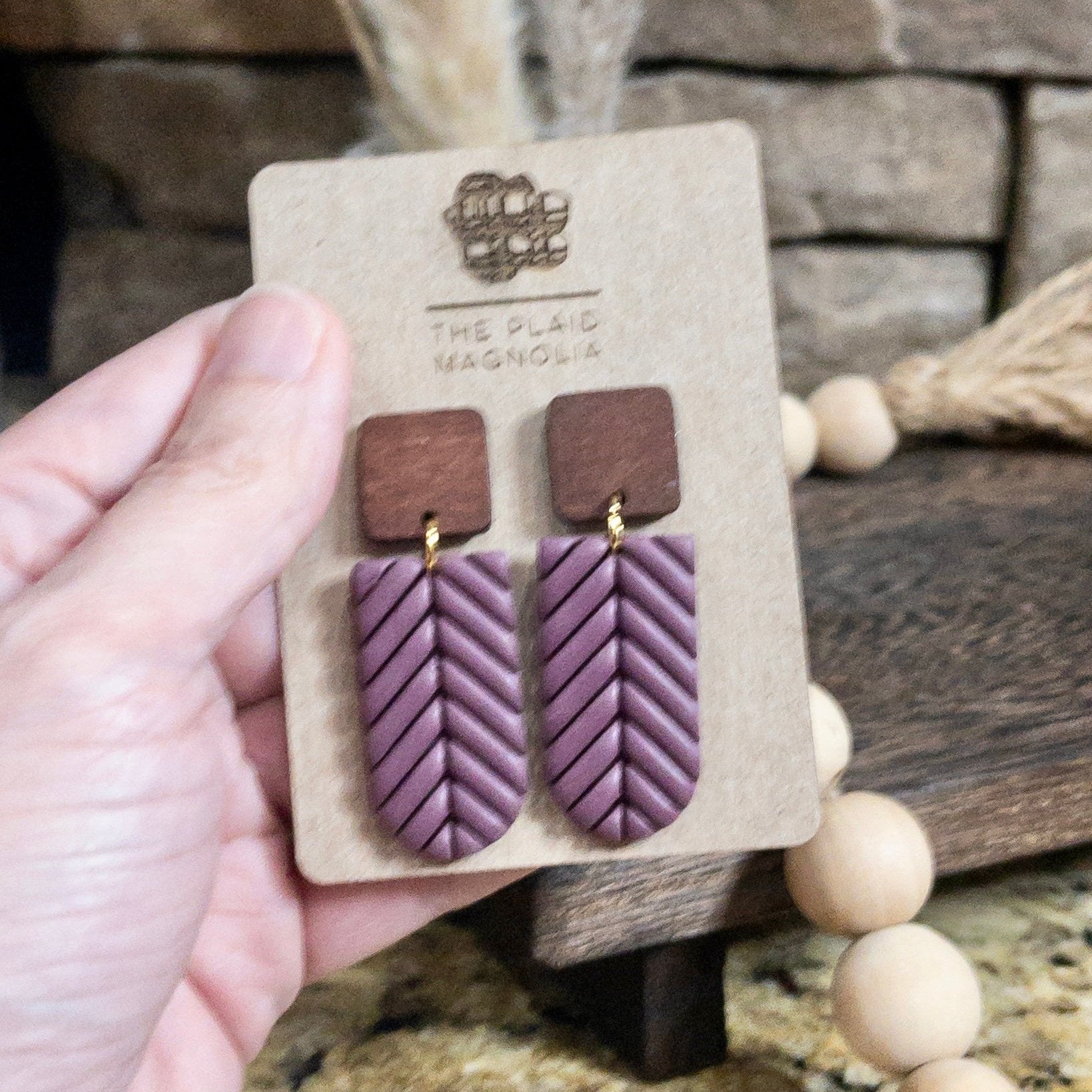 Introducing Rowan, a true work of art. These exquisite earrings feature a stunning chevron design crafted from premium polymer clay and wood. Available in elegant eggplant or chic smoke gray, these earrings are a must-have for any fashion-forward woman who appreciates the finer things in life. Enhance your style and make a statement with Rowan.